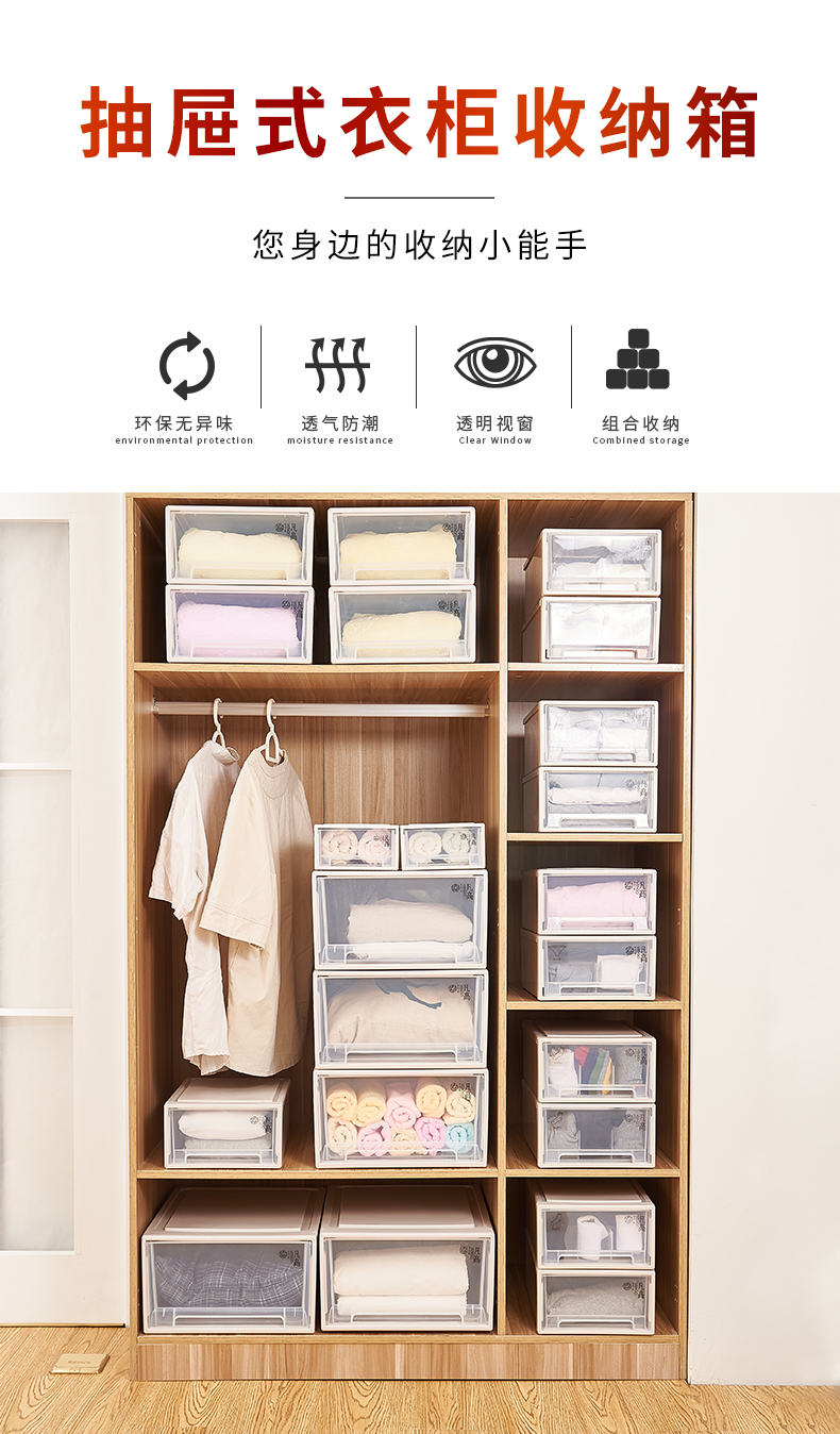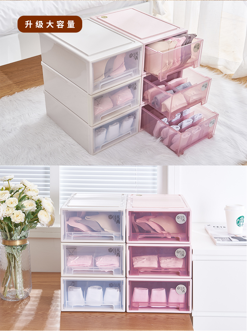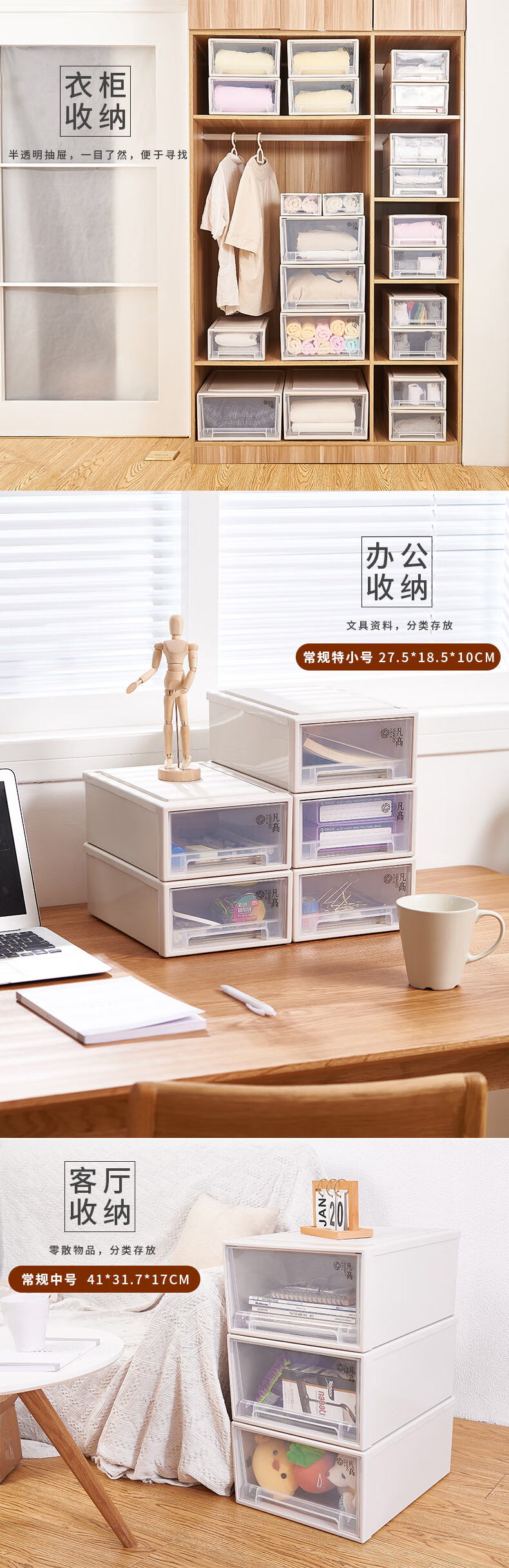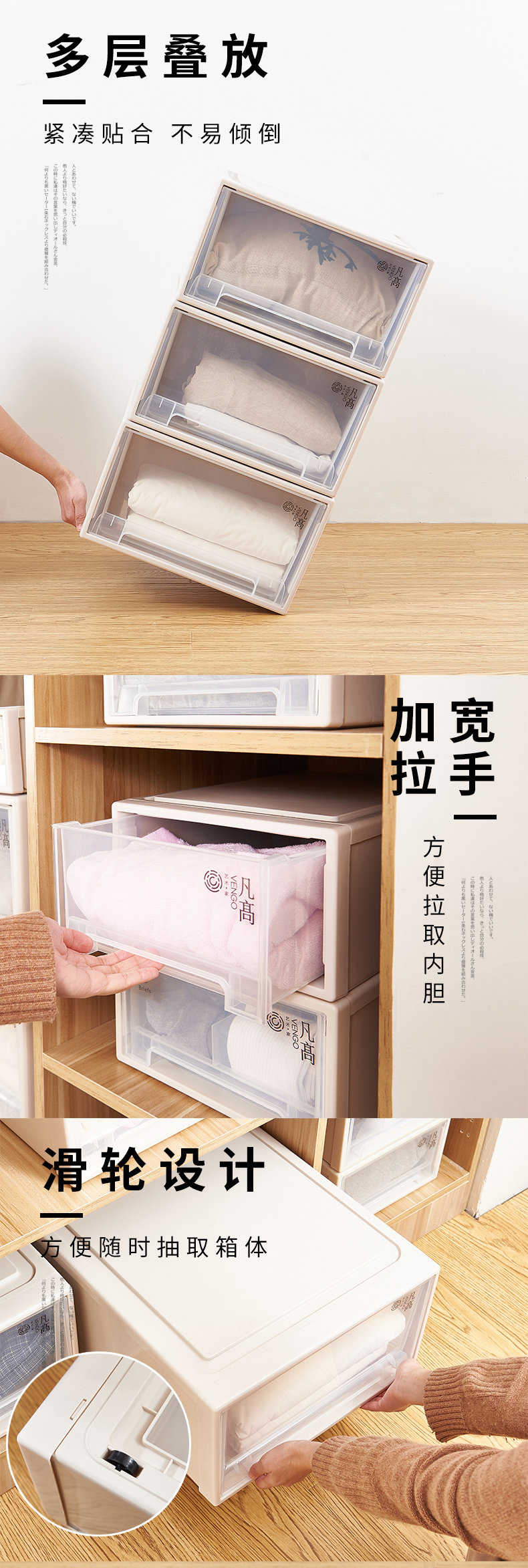 凡高(VENGO) 收纳箱 抽屉式收纳柜 40L带滑轮3个装特大号透明塑料衣物整理柜 床底储物柜