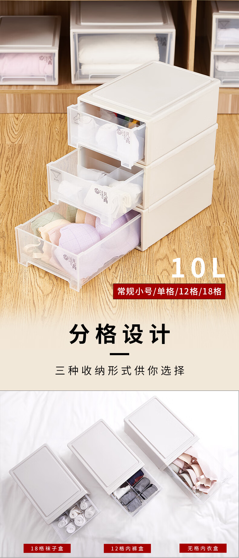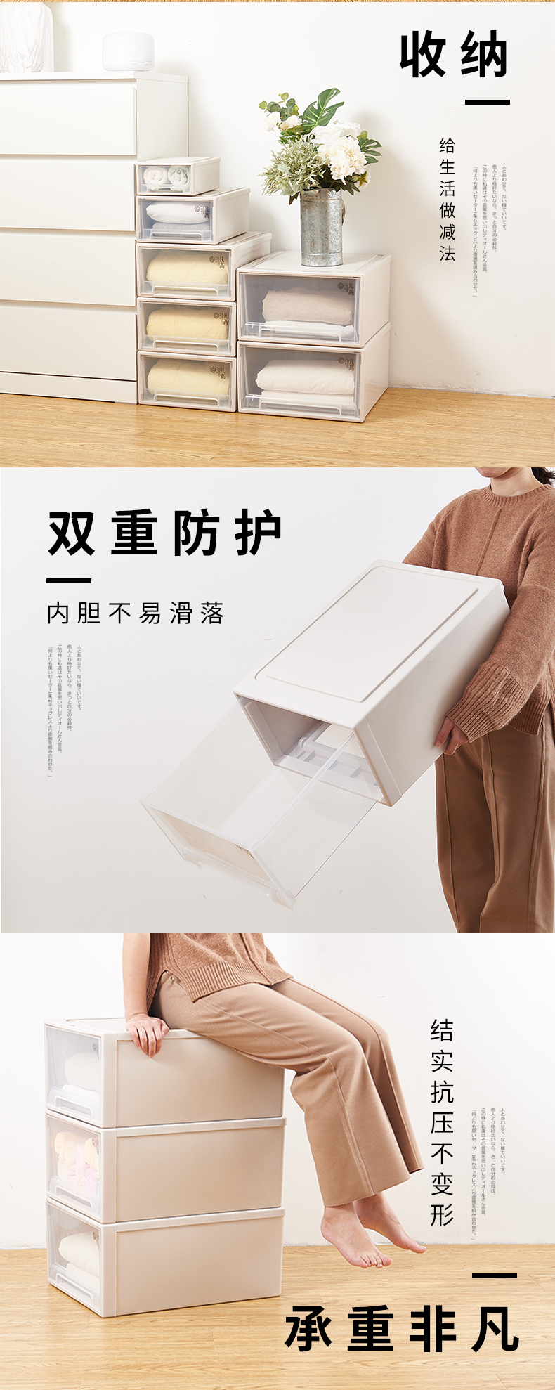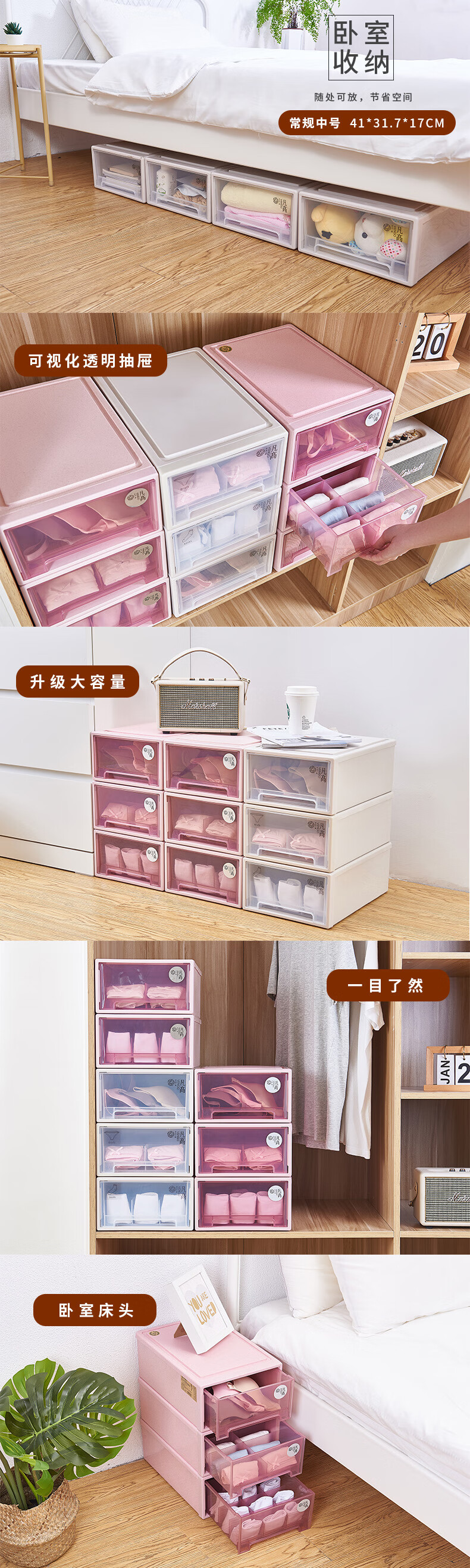 凡高(VENGO) 收纳箱 抽屉式收纳柜 40L带滑轮3个装特大号透明塑料衣物整理柜 床底储物柜