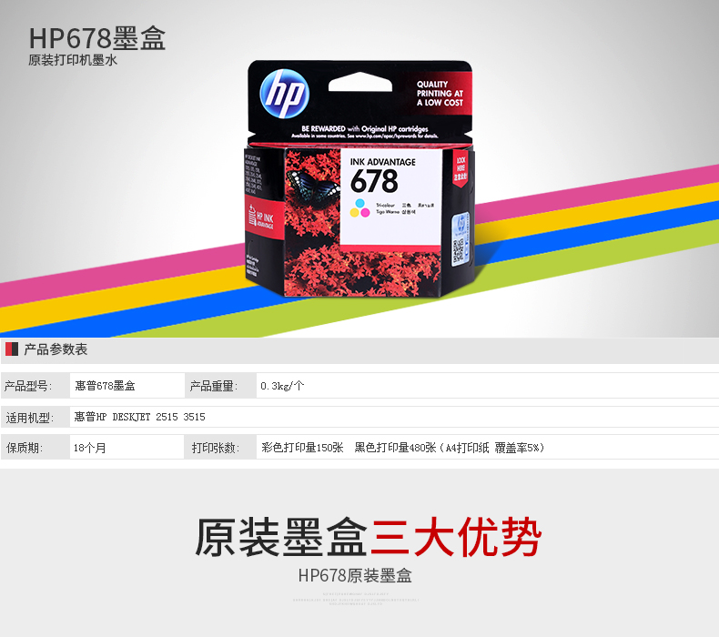 惠普原装678彩色/黑色墨盒适用于hp2648 4518 3548 1518 1018 4648 2548打印机