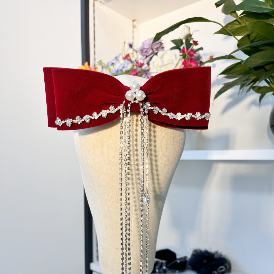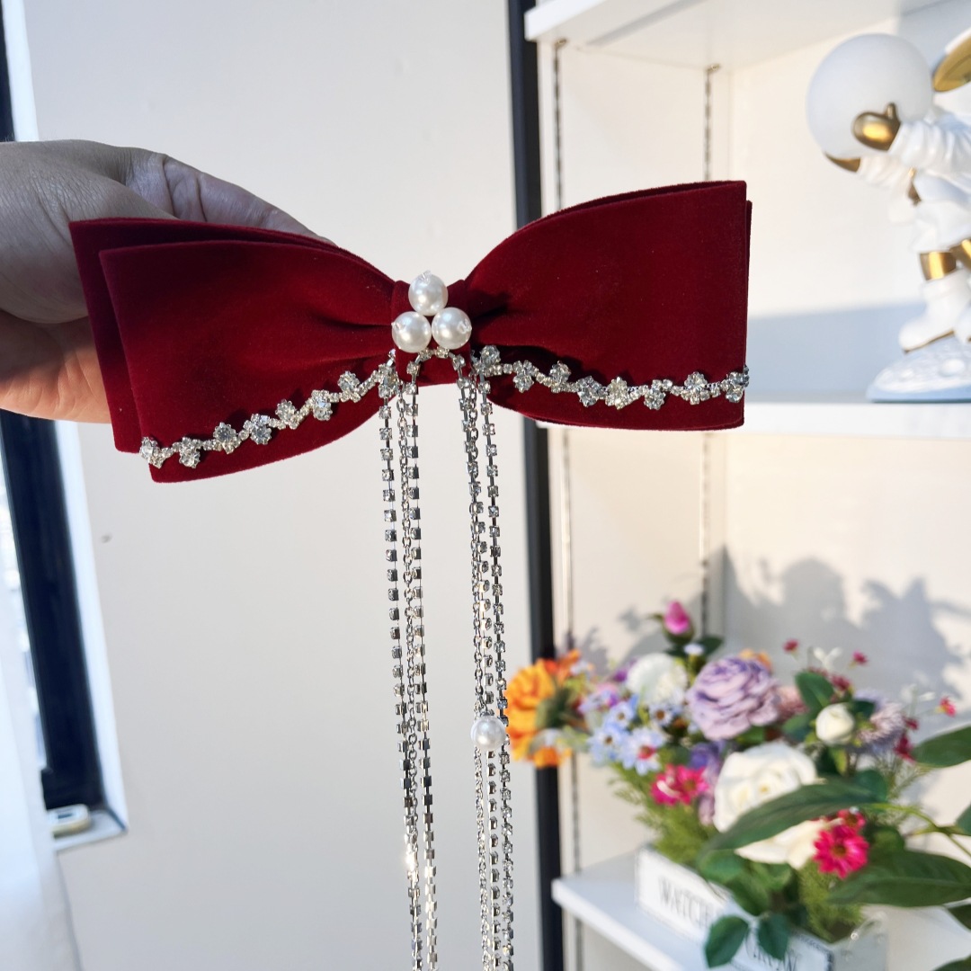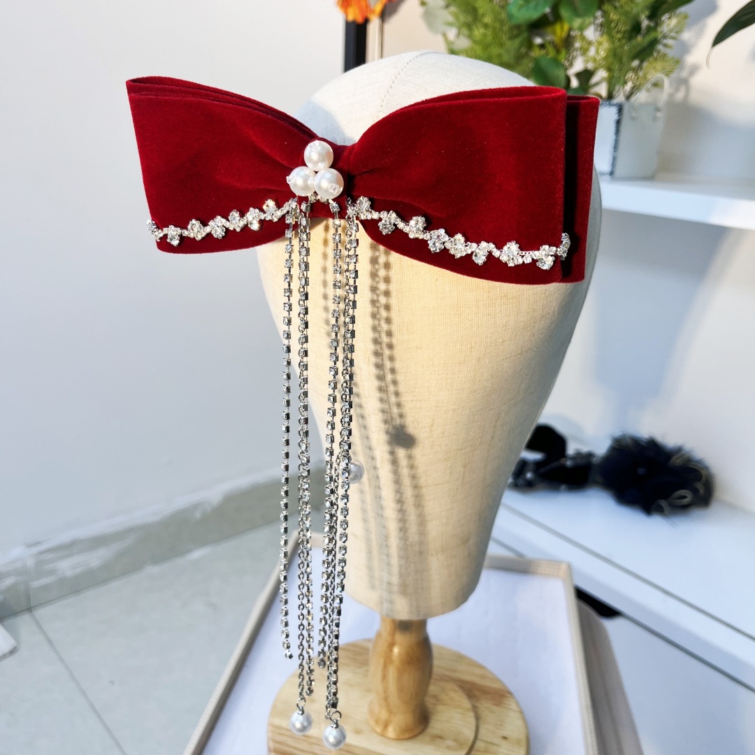 喜庆蝴蝶结头饰丝绒镶钻发夹流苏镶钻气质时尚发饰敬酒服饰