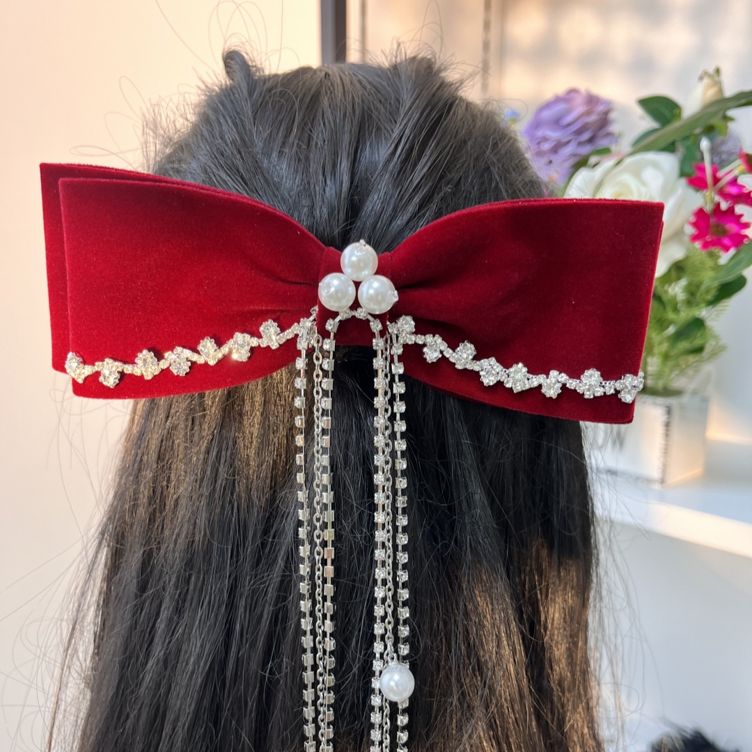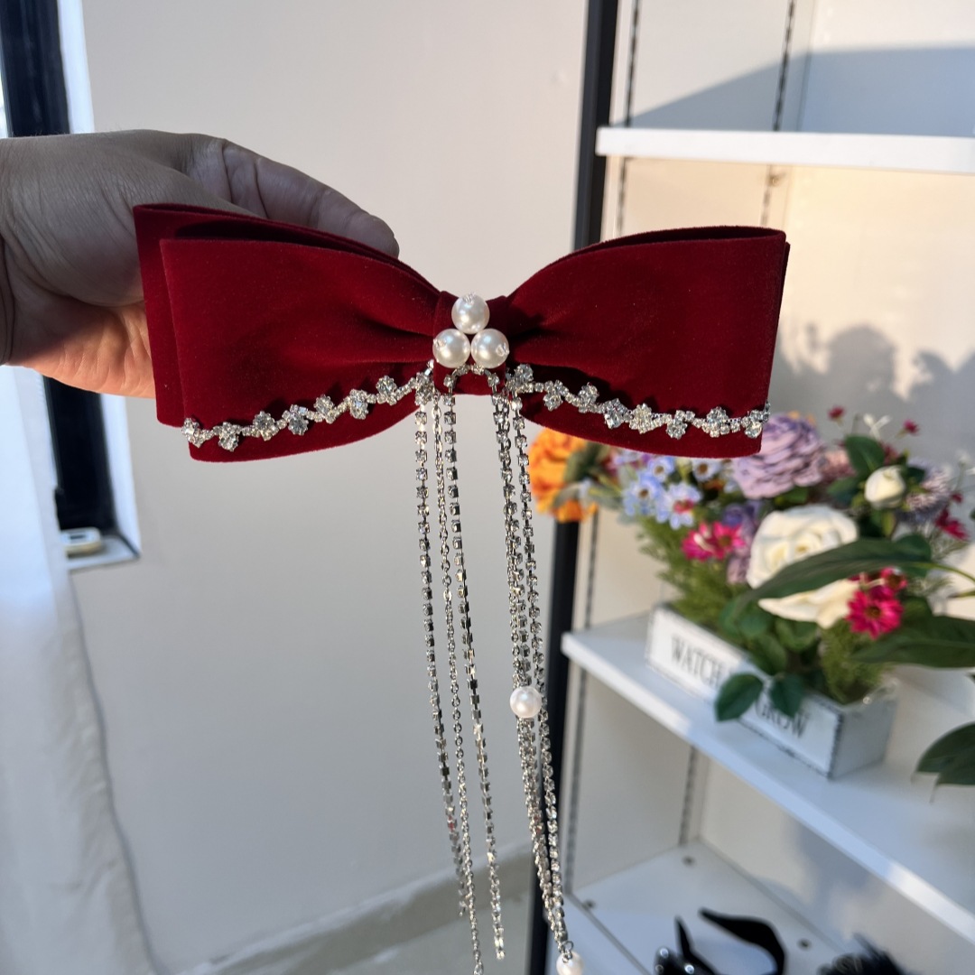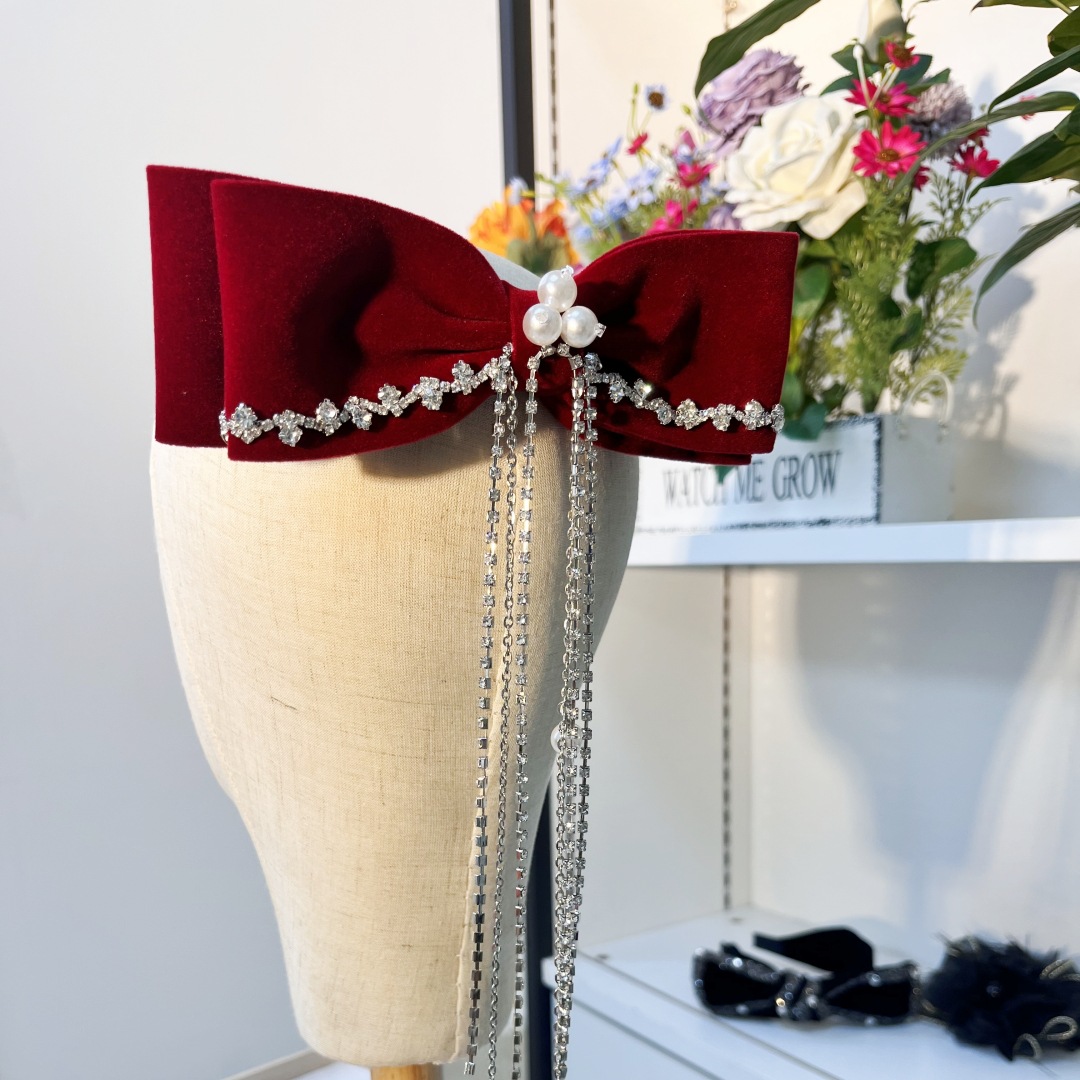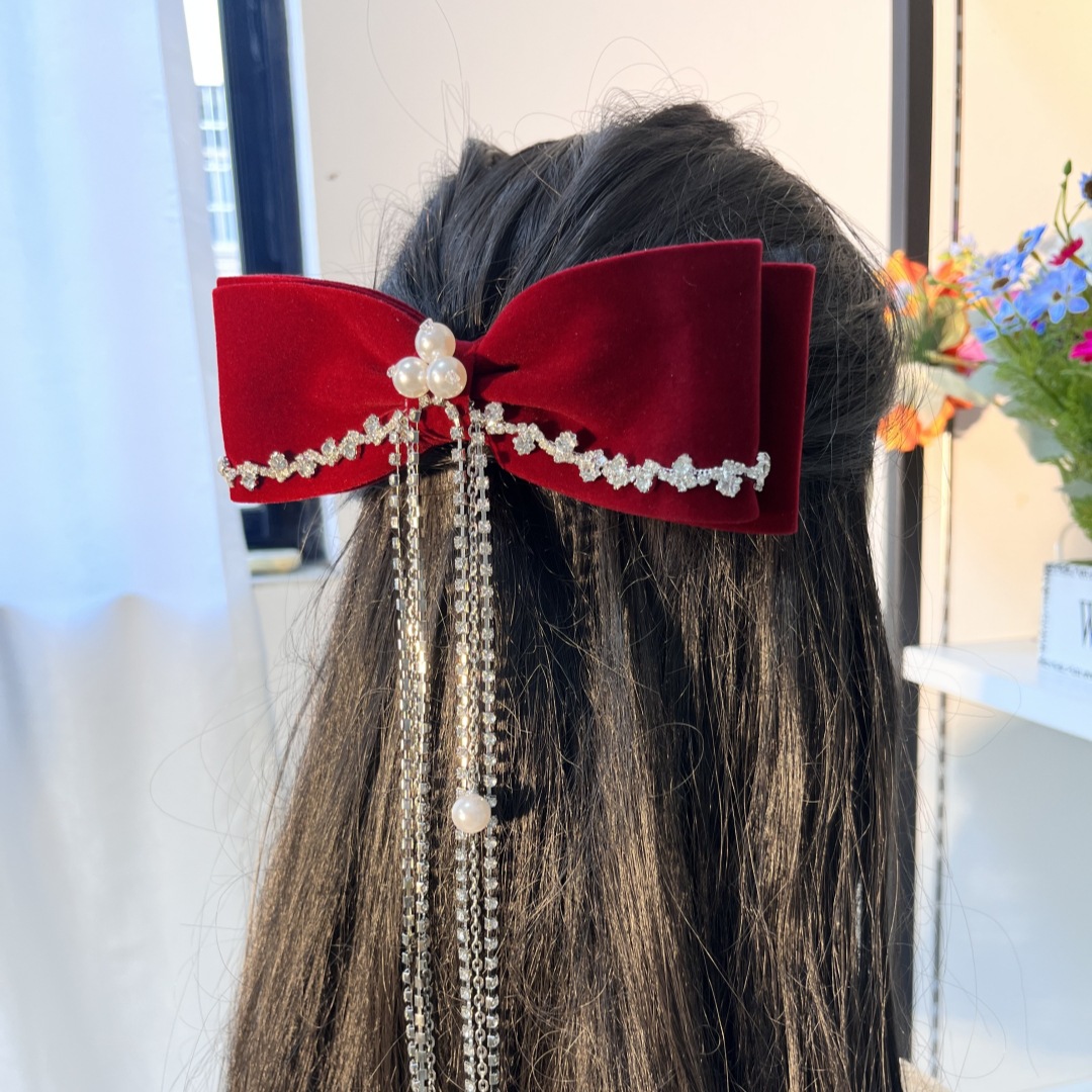 喜庆蝴蝶结头饰丝绒镶钻发夹流苏镶钻气质时尚发饰敬酒服饰